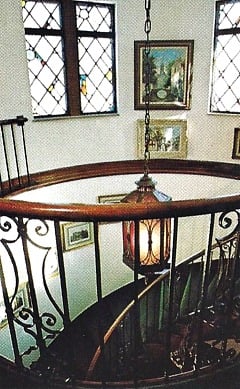A spectacular two-story tower with a conical slate roof is adjacent to the massive oak-paneled front door. A dramatic curved stairway dominates the foyer, with a sweeping wrought iron bannister that spirals upward two stories. A large hanging chandelier of brass and stained glass drops dramatically from the second-floor ceiling to illuminate the entryway. For the past twenty-four years, the Zeidlers have placed a freshly-cut fourteen-foot Christmas tree in this spot, brought down from their tree farm in Gaylord, Michigan.